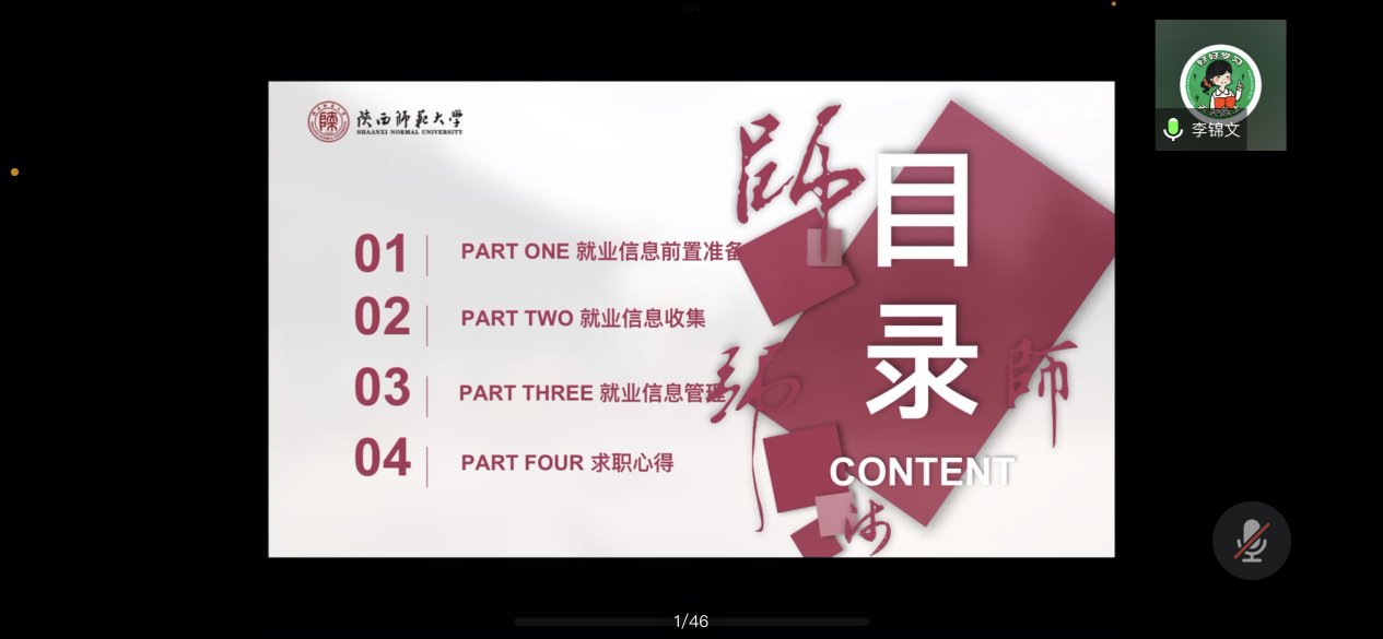会上,2019级金融学(数量金融创新实验班)李锦文围绕“信息前置准备”“信息收集”“信息管理”三个专题进行分享,他以人力资源岗位实习经历所见所感出发,讲述了参与求职前的信息准备流程和注意事项,并引导同学们进行求职的职业规划与自我定位,关注个人与企业的匹配度的重要性。其次,他以图文的方式介绍了企业小程序、学校公众号、学校就业平台等多种获取就业信息的渠道,并提醒同学们做好信息筛选和总结,并做好投递前后信息台账管理。最后,他结合自己的实习和求职经历,与同学们分享了秋招时的所见所闻,并鼓励同学们要提高主动性,积极争取求职机会,并祝愿同学们可以在求职历程中收获成长。随后,2019级金融学(数量金融创新实验班)杨杰克与2019级市场营销专业张浩军围绕自己的秋招经历与大家分享了求职心得,2019级电子商务专业王梅、研究生兼职辅导员陈彦杭积极主动地分享了自己在实习中面临的困难与解决途径,并提醒同学们增强求职期间自我安全防范意识,警惕就业陷阱,确保就业安全。最后,2019级本科生辅导员郭娴怡进行总结,她鼓励同学们要大胆“走出去”,积极主动探索信息,抓住机遇,积极行动,并祝愿同学们择业顺利,就业成功。