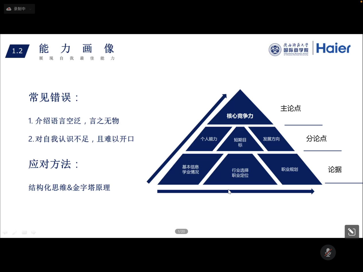 牛利华先通过案例引出个体面试自我介绍中的常见错误,并介绍了自我介绍的正确流程和有关注意事项,整体逻辑和表达顺序为自我盘点与介绍、配岗位匹配情况、未来合作展望。随后,她带领同学们进行自我能力画像分析,做好求职定位,并通过例子向同学们讲解不同岗位的自我介绍表述。其次,牛利华围绕面试环节中的“问题回答”板块进行技巧梳理,她指出,同学们拿到问题后要注意解读提问意图,对问题进行有效分类,并利用STAR法则来组织语言,表达要言简意赅、自信大方、逻辑清晰。再者,关于面试中的“提问环节”,牛利华通过场景案例进行解析,她提醒同学们可围绕“岗位职责要求”“公司人才培养机制”“个人短板”等内容进行提问,并在得到面试官回复后,及时表达感谢、反馈跟踪及主动争取,以赢得面试官的好感。最后,牛利华建议同学们结合首因效应,不断提升语言表达力与气场感染力,并注意面试官的反映,随时调整个人表达内容;在面试礼仪方面,重点注意着装、仪容、仪态。