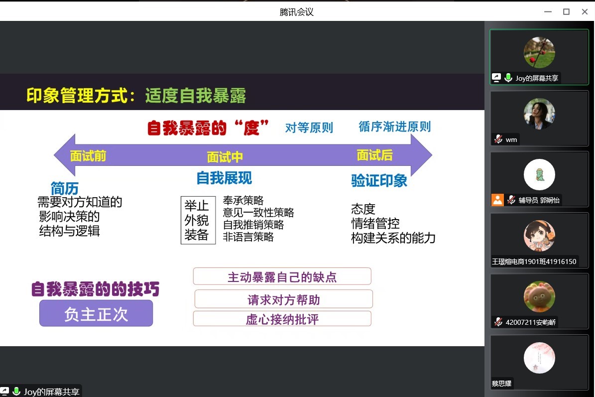 丁越兰从印象管理的概念、特点和关键出发,带领同学们理清就业面试基本流程,并以生动的例子向同学们讲解面试中的隐藏考验,减轻同学们对于面试的恐惧心态。会上,丁越兰围绕自我概念的三个关键,建议同学们充分进行自我认识的分析,用真实客观的角度来选择自己的职业发展路径;并以自己的面试广东一家公司的亲身经历向同学们传递面试过程中沟通和展示技巧:注意倾听,在回答的时候尽可能语句客观平和,展现个人的魅力,以充分的准备良好的面貌通过职场中的考验。最后,丁越兰结合同学的提问,建议同学们在面临面试压力时,及时摆正心态,积极应对,适当使用幽默的方式化解尖锐的问题,展现出个人良好的能力和职业素质。