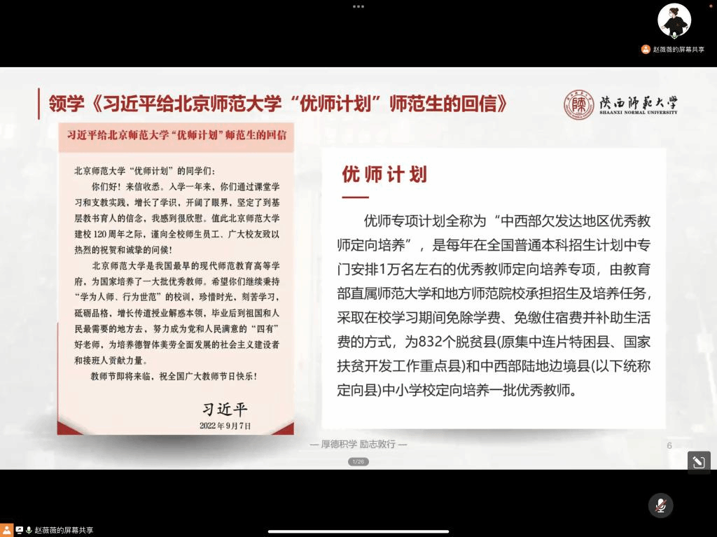 根据中央教育工作领导小组秘书组、教育部党组《关于教育系统深入学习贯彻习近平总书记给北京师范大学“优师计划”师范生重要回信精神的通知》精神和工作要求,为深入学习领会习近平总书记重要回信精神,按照学校党委工作安排,白菜官网组织学院师生通过线上线下相结合、集体学习与个人自学相结合的方式,深入学习了习近平总书记重要回信精神。