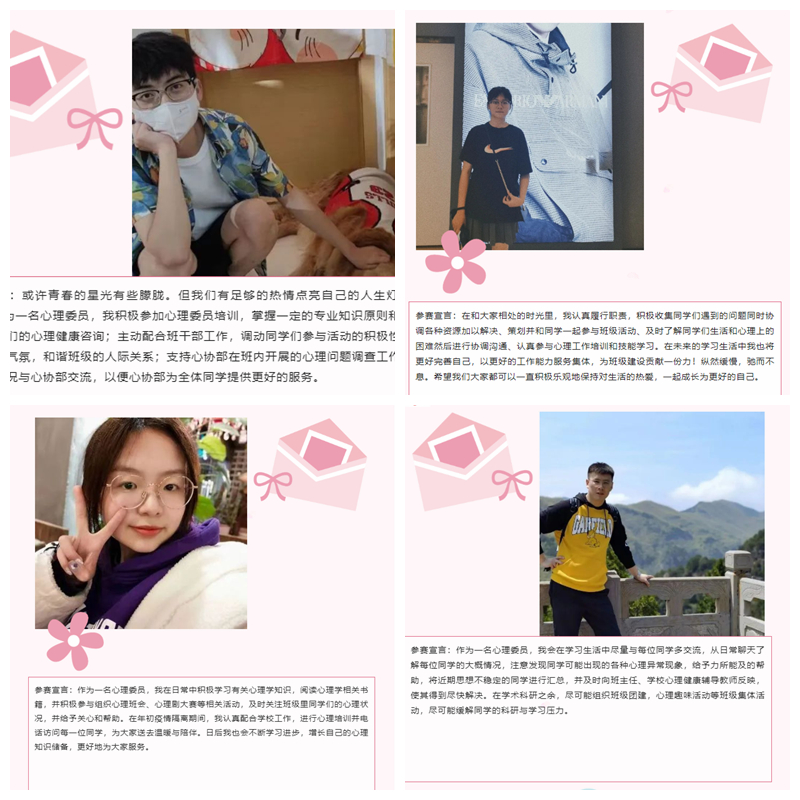 为进一步加强白菜官网心理健康教育工作,增强班级之间心理健康教育工作的交流学习,鼓励和表彰优秀的心理委员。5月19至5月20日,学院依托二级心理辅导站闻澜阁开展了十佳心理委员评选活动。根据各班心理委员工作实际情况,经线上投票,学院学生会实践部复核,最终十名心理委员被评选为2021-20221学年优秀心理委员。