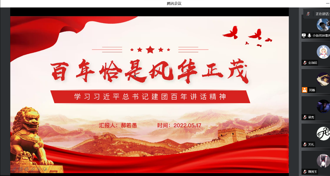 会上,王昱博、郝若愚两位同志带领大家学习了习近平总书记在庆祝中国共产主义青年团成立100周年大会上的讲话。在讲话中,习近平总书记提出新时代的广大共青团员,要做理想远大、信念坚定的模范,要做刻苦学习、锐意创新的模范,要做敢于斗争、善于斗争的模范,要做艰苦奋斗、无私奉献的模范,要做崇德向善、严守纪律的模范。史一可、孙慧敏两位同志带领大家学习了习近平总书记在中国人民大学考察时的重要讲话精神。他们介绍到,在2022年五四青年节前夕,习近平总书记走进了中国人民大学考察,先后走进思政课智慧教室、博物馆、图书馆,了解学校促进思政课教育改革创新、学校历史沿革、教学科研成果、加强文献古籍保护利用和促进理论研究成果转化应用等情况,并主持召开师生代表座谈会,发表重要讲话。