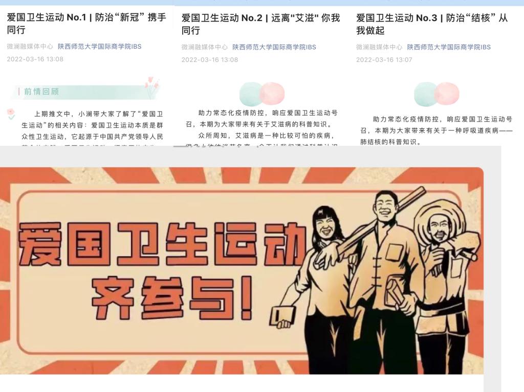 学院利用官方微信公众号,发布《爱国卫生运动,齐参与!》《爱国卫生运动 No.1:防治“新冠” 携手同行》《爱国卫生运动 No.2:远离"艾滋" 你我同行》《爱国卫生运动 No.3:防治“结核” 从我做起》等系列推文,教育学生学习了解爱国卫生运动的历史背景、精神内核及践行方式,学习掌握新冠肺炎、艾滋病、肺结核等传染性疾病的防控知识,引导学生在日常学习生活中讲究卫生,预防疾病,提高健康水平。