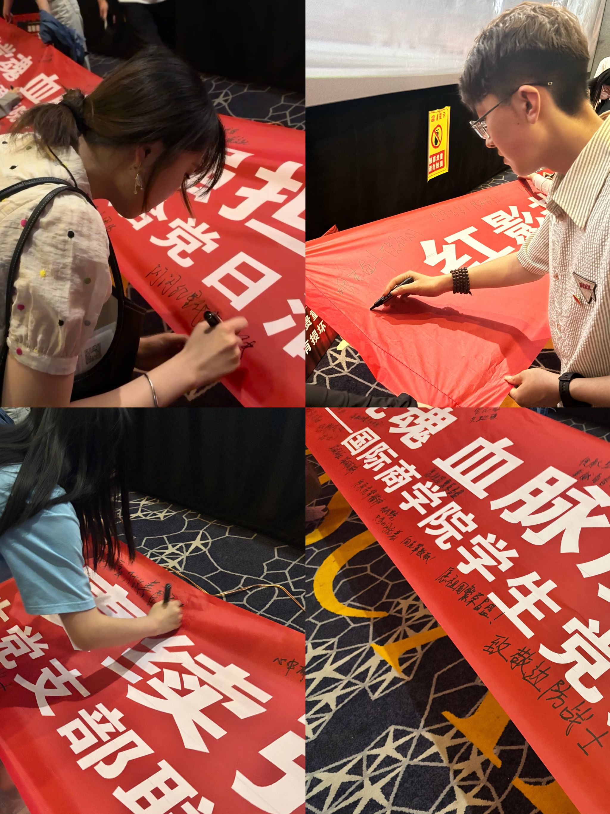 活动最后,全体同学在影城里合影留念。同学们有序走到影厅前的横幅旁,用马克笔写下自己的观影心得。横幅上密密麻麻的字迹,承载着每个人的真挚情感。青年党员们纷纷表示,将以此次活动为契机,把对祖国的热爱、对民族的责任转化为实际行动,在日常学习生活中主动促进各民族交往交流交融,共同守护好“中华民族一家亲”的美好家园。