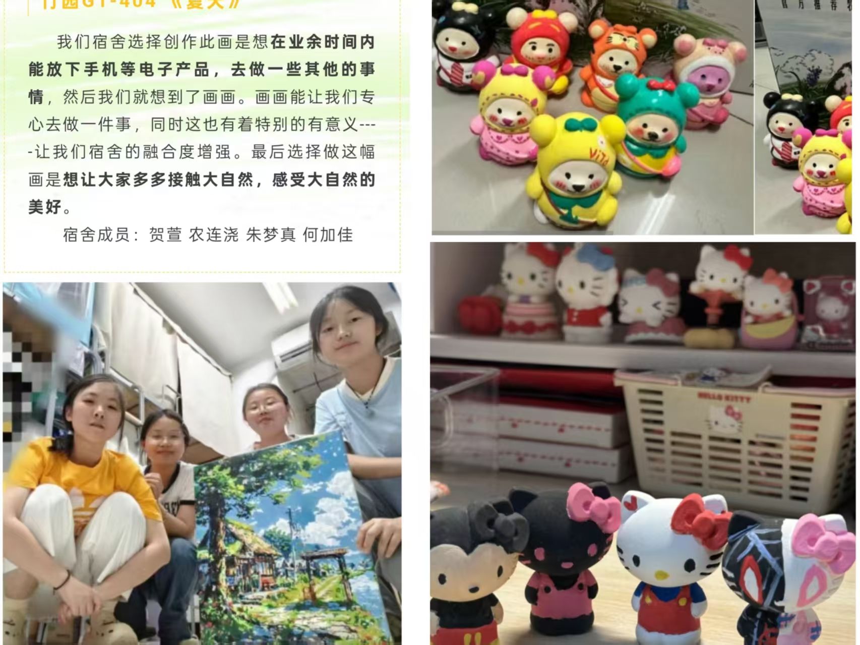 4月,各班开展“心向微光,愈见美好”心理团体辅导活动,以班级为单位,通过互动游戏、主题班会等在团体环境中挖掘学生潜能,增强集体归属感;5月,开展“春光作序,一见钟寝”宿舍文化节,通过让宿舍成员合作完成一件创意作品的形式,营造积极快乐的宿舍氛围,以合作创作促进室友情感联结。