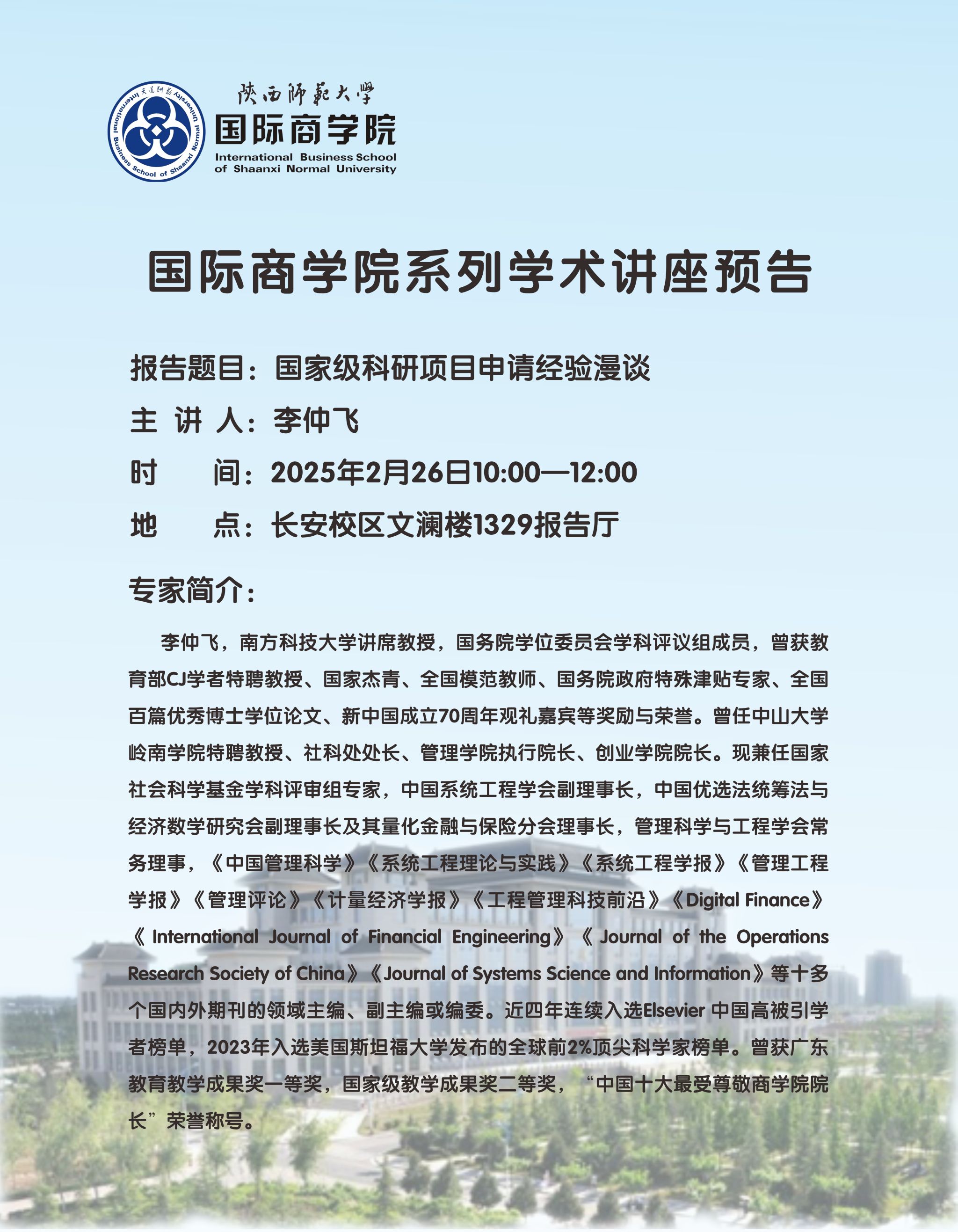 学术讲座预告——国家级科研项目申请经验漫谈