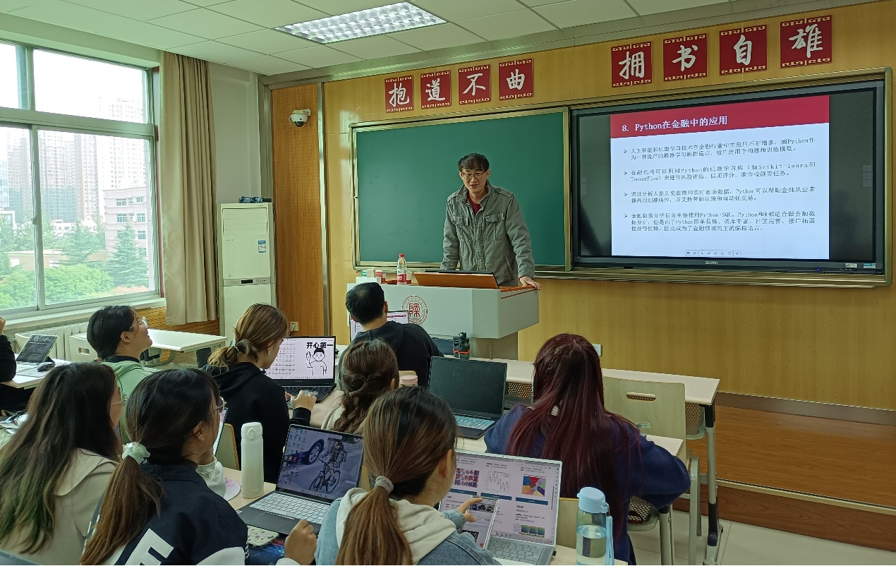系副主任刘杰首先介绍了王奇超老师的国外求学和工作经历,并希望同学们通过本次讲座进一步夯实金融学与计算机科学交叉学科知识,提高Python的专业应用能力。王奇超博士从Python一词的原意“蟒蛇”引入,介绍了Python语言的发展历程、编写特点以及存储方式等内容。他结合自身学习和科研经历,重点解读了Python语言的应用领域,主要包括人工智能、科学计算、数据分析及处理、自动化办公、网络爬虫和图形处理。