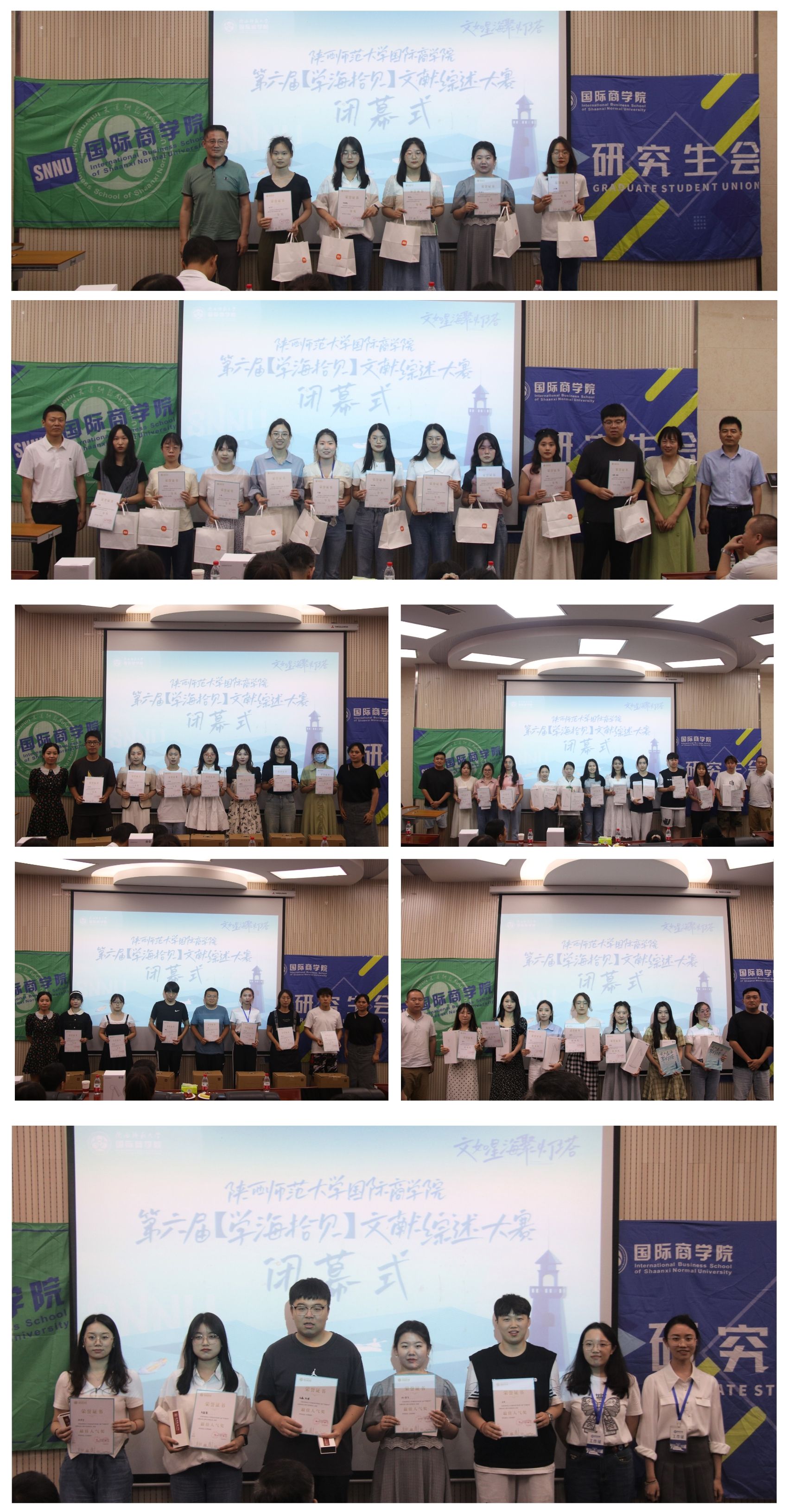 下午17时,闭幕式正式开始。闭幕式由2022级会计专硕一班的马可汗和葛菲菲同学主持。首先,研究生会通过视频的形式向大家展示了本届文献综述大赛从初赛到决赛的台前幕后。随后,各组评审老师依次作了精彩点评,他们一致表示,近年来同学们的参赛水平逐年提高,现场表现更加精彩,充分说明了文献综述大赛对于帮助同学们培养综合能力、积累科研技能起到了至关重要的作用。2022级工商管理专业翁惠斌同学分别从选题、文献查阅、综述撰写技巧与方法等内容向在场的研究生分享了参赛经验与感想,现场气氛热烈,同学们受益匪浅。学院党委副书记、纪委书记邱远航宣读了获奖名单,并与在场领导和评委老师们为获奖选手颁发了奖状和奖品。
