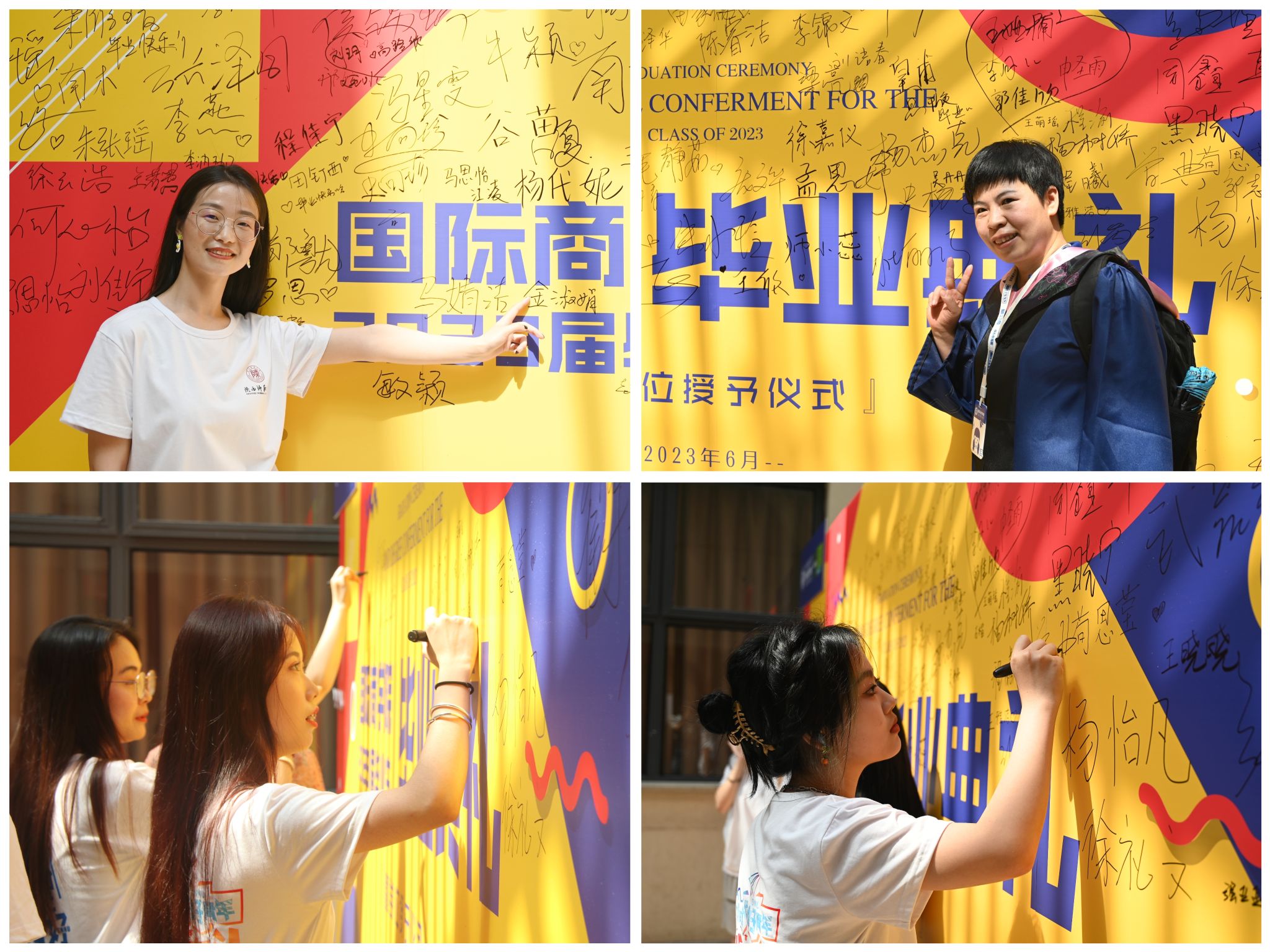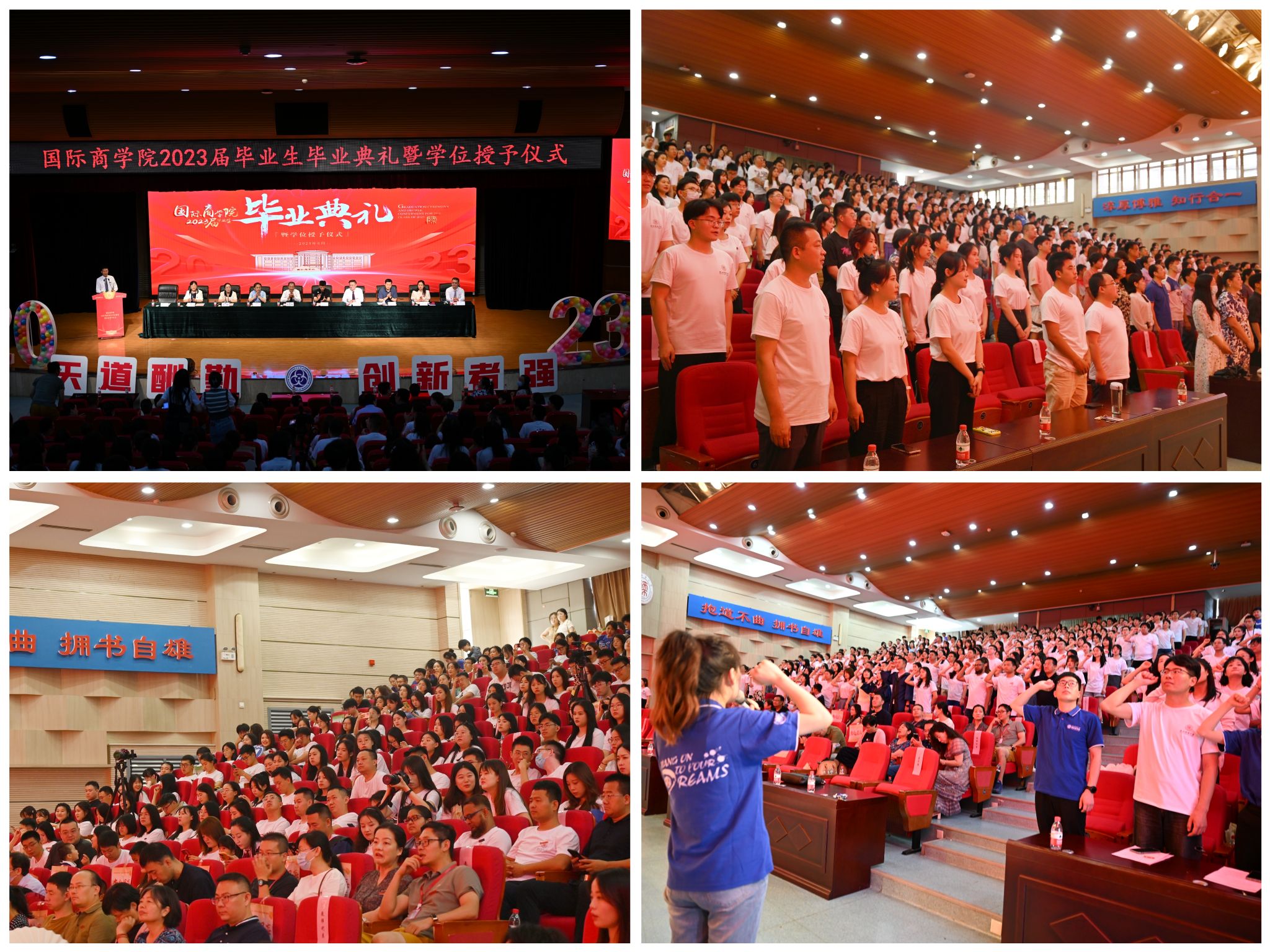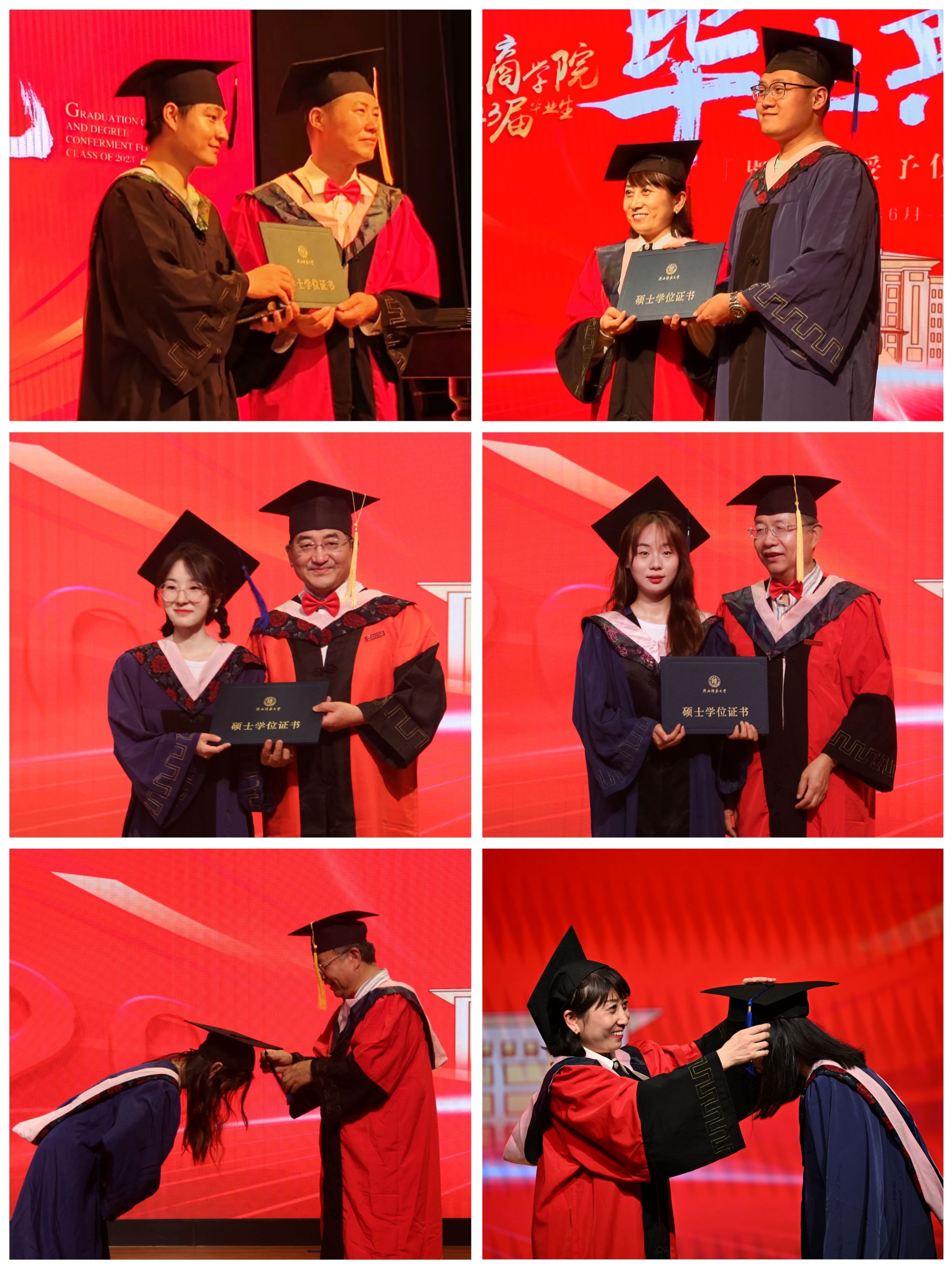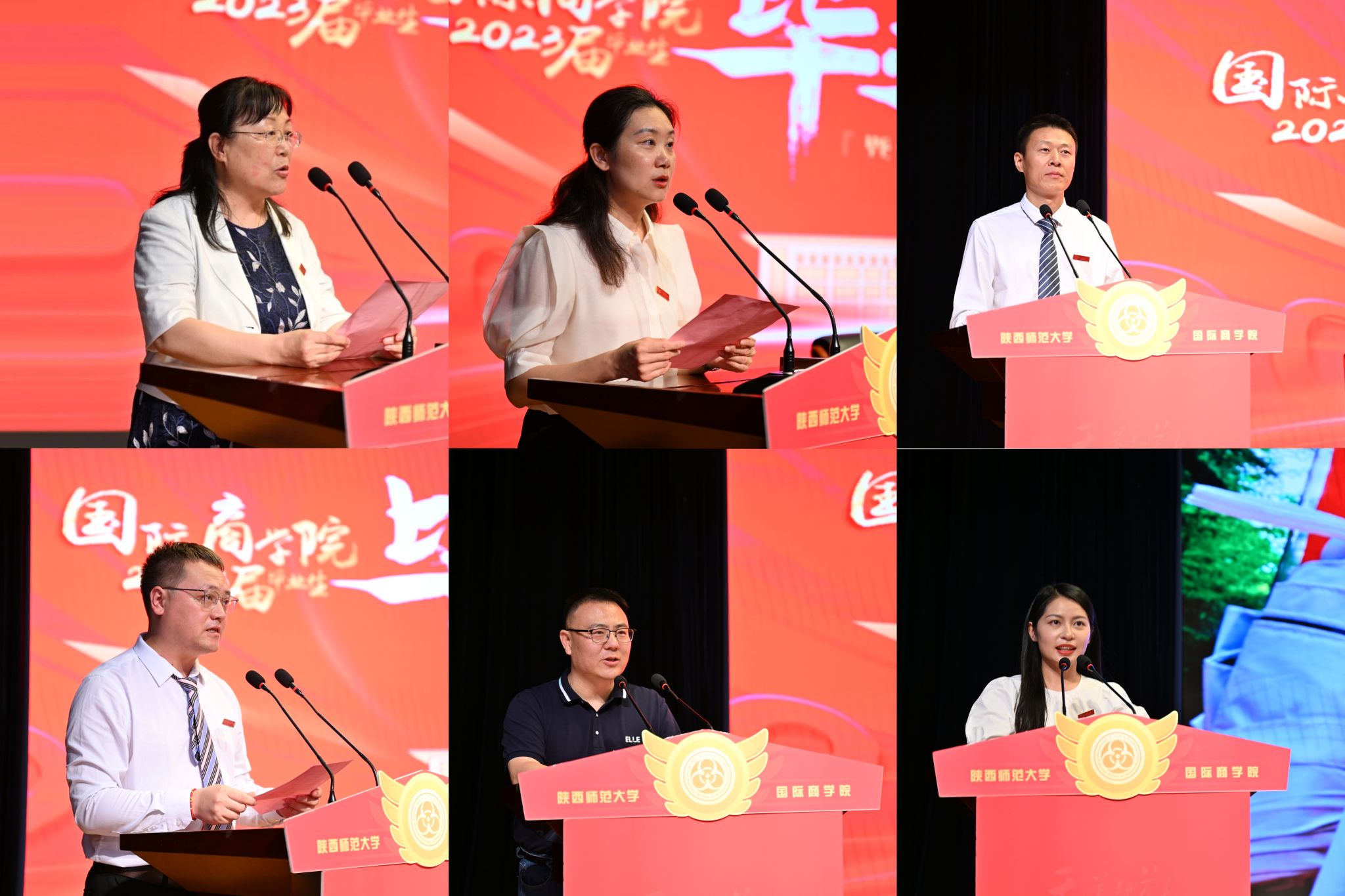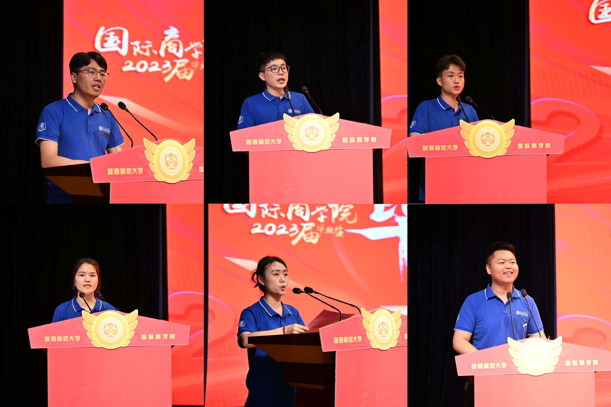 典礼在庄严肃穆的国歌中拉开序幕。博士点主任王琴梅和副院长史恒通分别宣读了研究生、本科生学位授予决定,副院长杨静宣读了2023届毕业生“优秀个人”名单。教师代表、经济系教授姚宇为毕业生们献上了诚挚的祝福和深切的寄语。他希望同学们在追求自己人生目标的同时要懂得平衡与兼顾,戒骄戒躁,脚踏实地,还提醒大家不论走到哪里都要始终永葆家国情怀,不忘初心,不懈奋斗。全日制硕士毕业生代表史杨季、非全日制硕士毕业生代表MBA方向姜永恒、本科毕业生代表杨杰克以及省级“优秀毕业生”代表位明茹相继发言。他们回顾了在学校取得的成长与进步,对学院的悉心栽培表达了诚挚的感谢,并表示各位毕业生将怀揣着对母校的感激之情,在未来的道路上学与行并进、理论与实践并行、学问与做人并重,在各行各业展现商院学子的良好精神风貌。在校生代表硕士生白婷和本科生王晨在发言中对学长学姐顺利完成学业表示祝贺,并承诺会以学长学姐们为榜样,脚踏实地,不畏困难。他们祝愿学长学姐们在今后的生活中能带着仰望星空的勇气和脚踏实地的底气去奔赴属于自己的星辰大海。