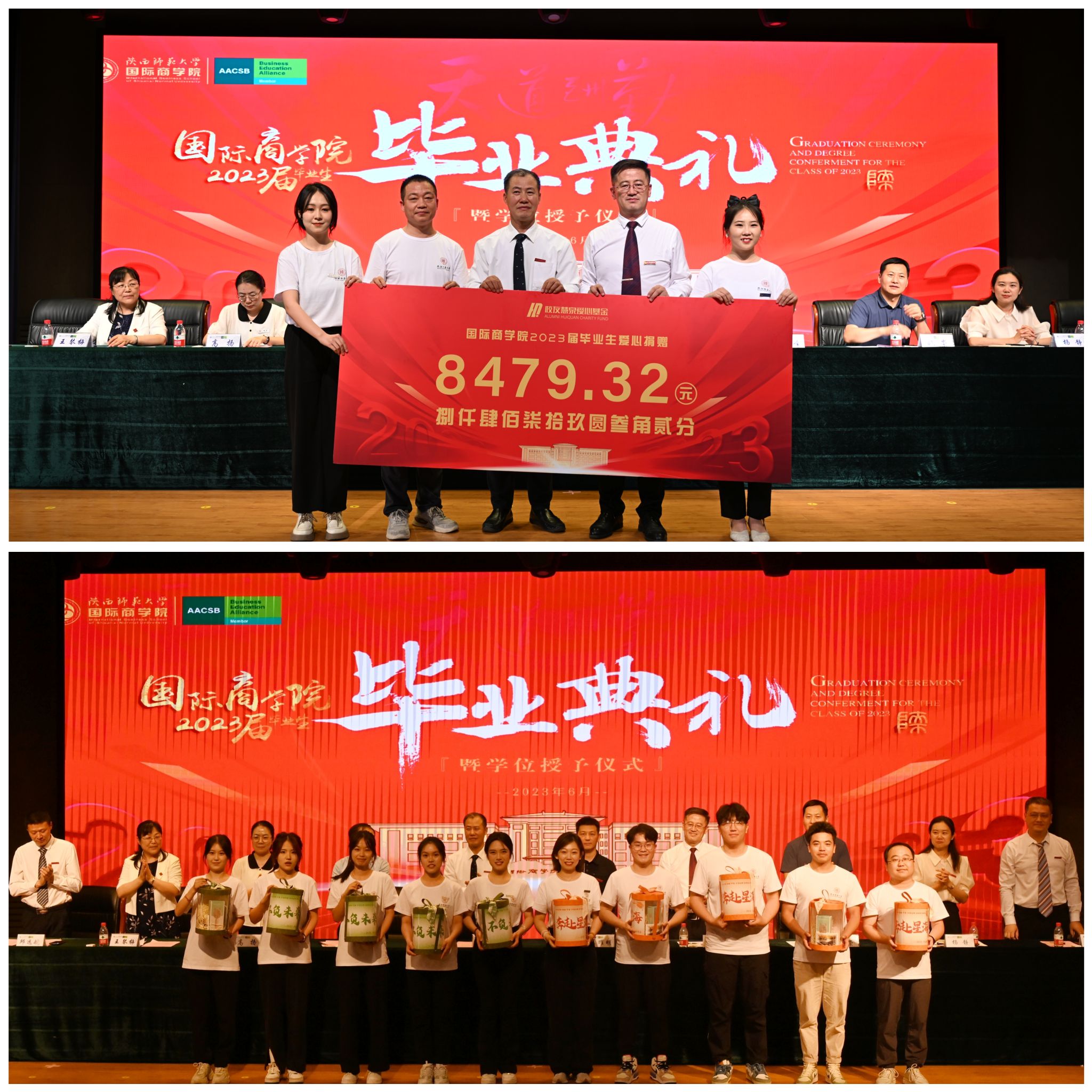 典礼现场,学院与毕业生互赠了纪念品。截至目前,学院全体毕业生向学院“慧泉基金”共捐赠8479.32元,毕业生代表向学院赠送了全体毕业生的捐款,以此表达对母院的感激之情,学院党委书记思培峰、院长雷宏振代表学院接受了毕业生的心意。学院也将精心设计、匠心定制的2023届毕业生专属毕业纪念礼物---600cc全讯白菜网2023届毕业纪念全家桶赠送给了全体毕业生。随后,毕业生代表田妍同学带领全体毕业生进行了庄严宣誓。