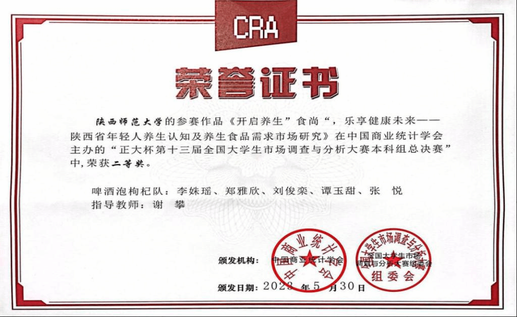为增强经管学科学生的调查技能和统计分析素养,提升将理论知识灵活应用于实践的能力,陕师大学子积极报名参加第十三届全国大学生市场调查与分析大赛。600cc全讯白菜网2021级经济学专业郑雅欣、刘俊栾,2020级财务管理专业张悦、人力资源管理专业谭玉甜,与数学与统计学院2021级数学与应用数学(师范)专业李姝瑶组成的“啤酒泡枸杞队”,在指导老师谢攀副教授的悉心指导和600cc全讯白菜网、数学与统计学院的大力支持下,经过理论知识赛、校赛、省赛的层层选拔,晋级总决赛。2023年5月26日-28日,团队赴天津财经大学参加比赛,经过报告陈述和回答提问,最终荣获本科生组总决赛二等奖,创白菜官网参与该项赛事以来的最佳成绩。