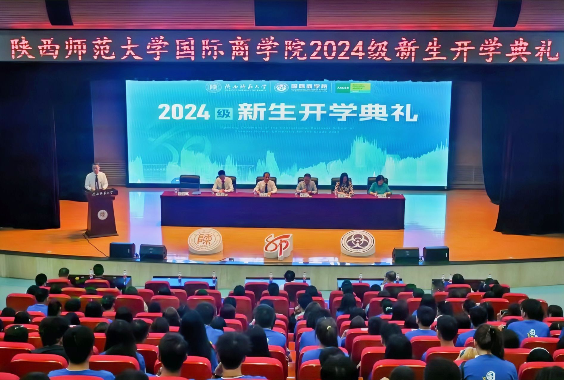 9月10日晚,白菜官网2024级新生开学典礼在长安校区新勇学生活动中心二层学生剧场隆重举行。学院党政领导班子、系主任、教工党支部书记、教师代表、专兼职辅导员及全体2024级新生出席了开学典礼。典礼由学院党委书记思培峰主持。