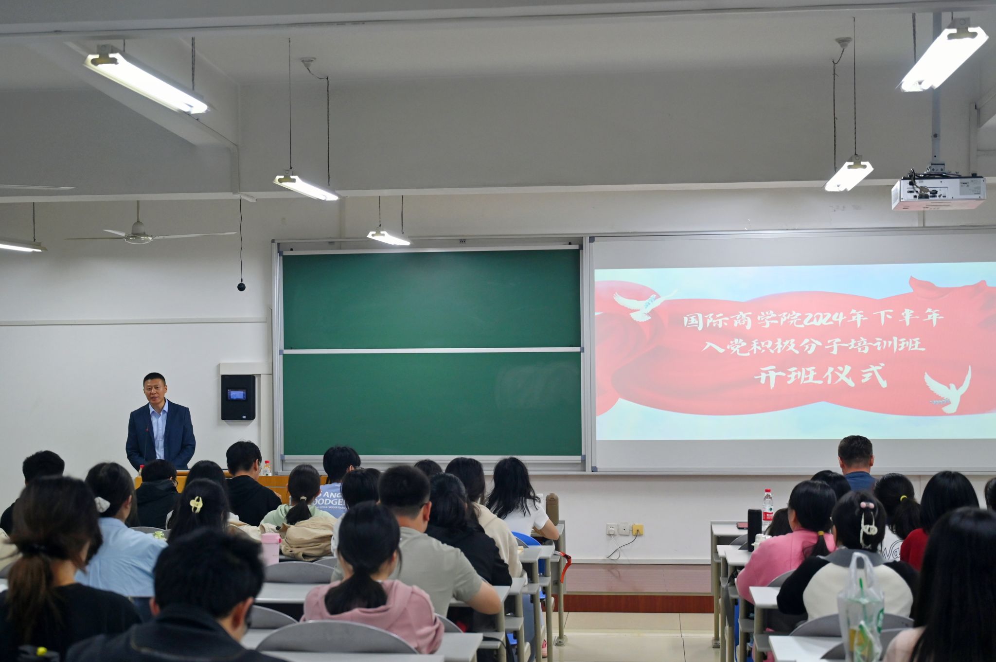 10月16日晚,培训班开班仪式在文津楼3424教室举行。白菜官网党委书记思培峰,党委副书记、纪委书记邱远航,辅导员杨涛,兼职辅导员吴恒及103名入党积极分子参加了开班仪式。仪式由邱远航主持。开班仪式上,邱远航介绍了此次培训班的学员产生过程、人员构成情况以及党课培训相关安排,并要求全体学员严格遵守培训纪律,高质量完成各环节培训,在党课上有所思、有所想、有所收获,争取早日加入中国共产党。