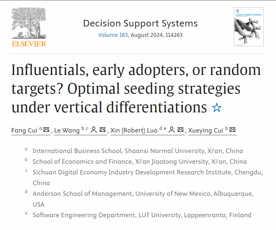 白菜官网崔芳老师在Decision Support Systems国际TOP期刊中发表论文“Influentials, early adopters, or random targets? Optimal seeding strategies under vertical differentiations”,论文研究了在垂直差异化市场中,选择最佳种子用户策略(影响者、早期采纳者或随机目标)来推广新产品的关键在于平衡消费者传播负面口碑的可能性以及产品的质量和品牌实力。