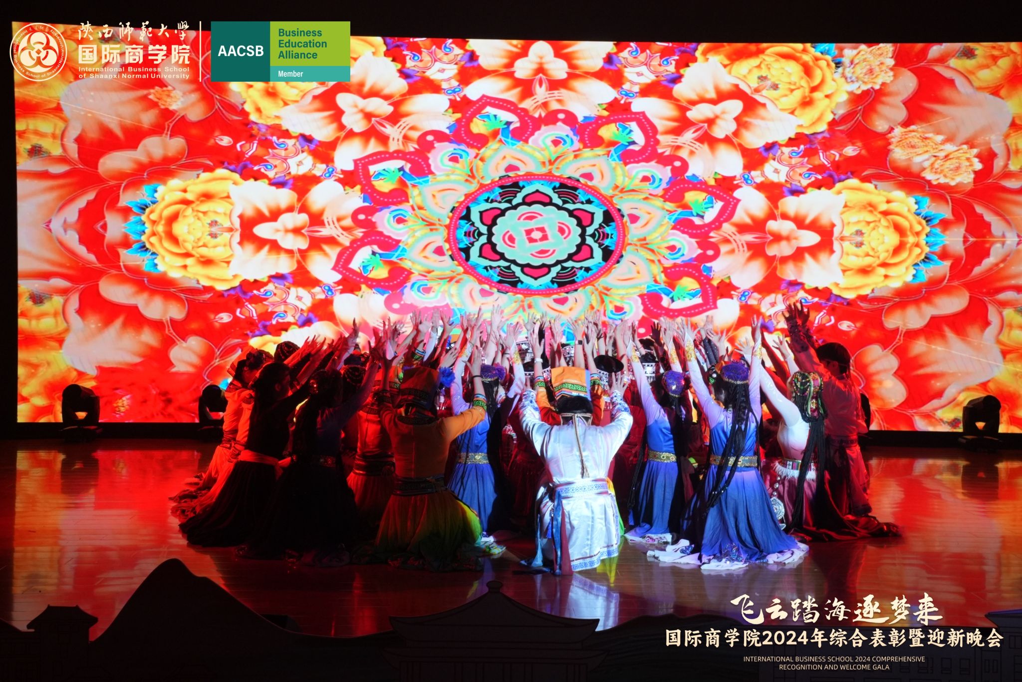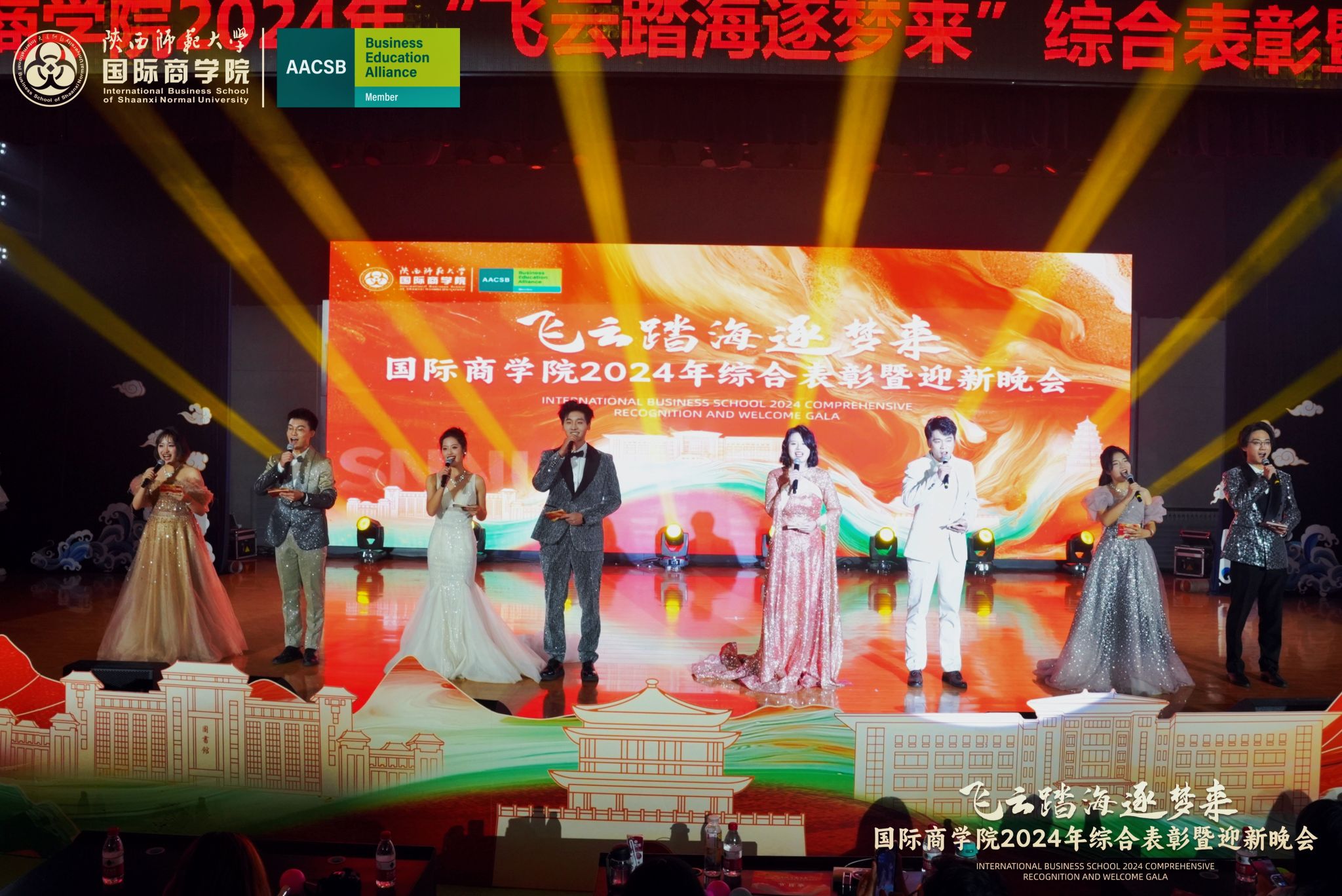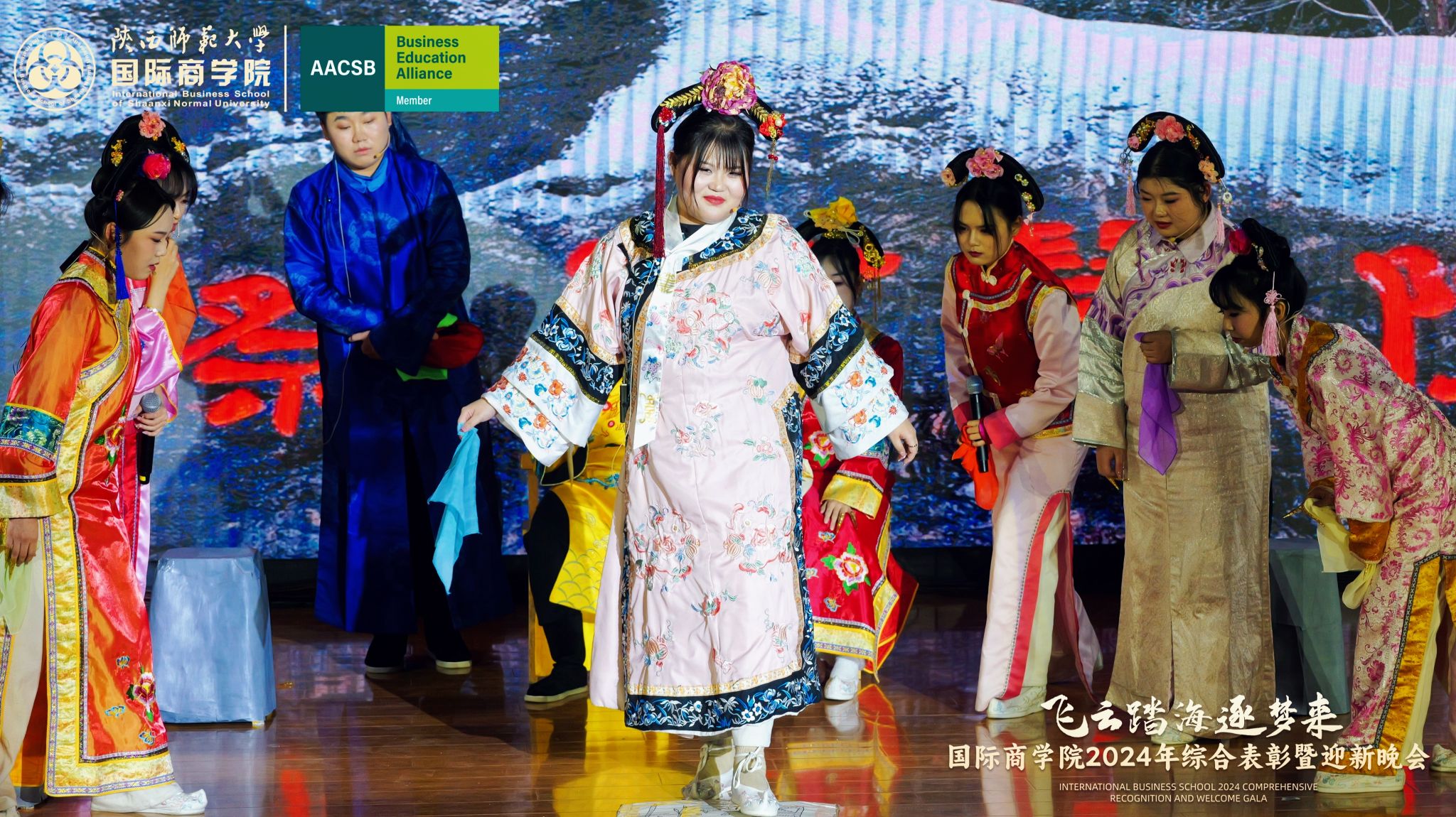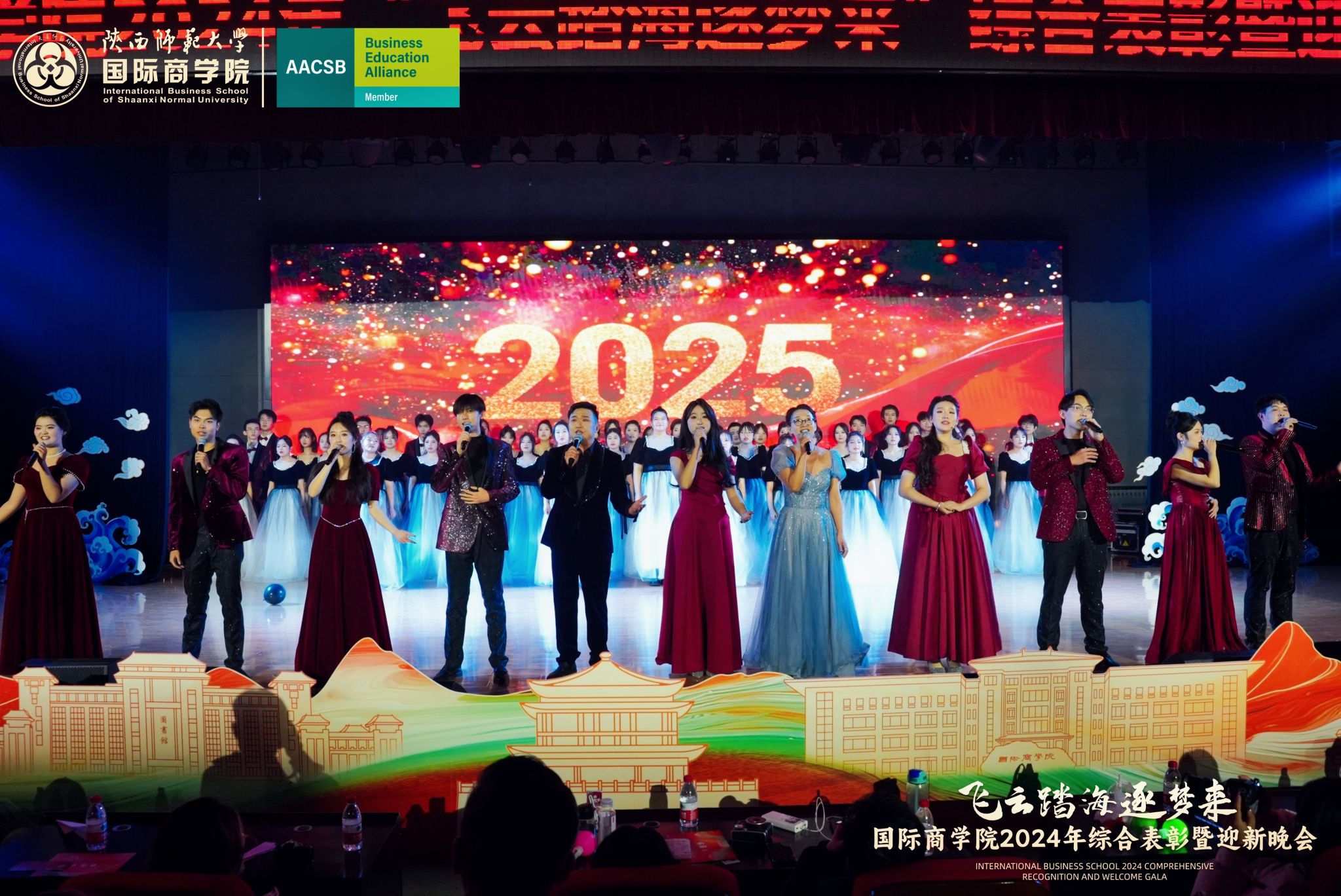 晚会上,来自学院的300余名研究生、本科生为现场观众呈现了一场精彩的视听盛宴。开场舞《飞云踏海逐梦来》以灵动之姿,绘新年繁盛之景,引吭高歌,唱响时代的旋律。第一篇章现代舞《梦想嘉年华》舞步间丈量梦想无垠,汗水里浇灌成长盛放,梦想照进现实,青春永不落幕;主旋律音画时尚《见信如晤》商院才俊,细语低吟,旋律飘渺,倾吐心扉;校园轻喜剧《时间都去哪了》回忆起入学时的青涩,笑迎每一个新的开始,心中满是喜气洋洋;活力歌伴舞《赞赞陕师大》共贺祖国七十五载盛世华诞,共祝师大八秩荣光璀璨征程。第二篇章民族大联欢《星辰大海踏歌去》五彩斑斓的服饰,舞动着千年的传说,跨越山川湖海,传递和平与希望的讯息;相声《恋爱专家》妙语连珠,将恋爱中的点点滴滴娓娓道来,让我们领悟爱情的真谛,在欢笑中感受甜蜜与智慧的碰撞;古典舞剧《上春山》盎然春意随舞者轻盈的身影扑面而来,以舞蹈为语言,连接过去与未来;由蓝草吉他社带来的器乐演唱《奔·流》带着一往无前的气势,唤醒我们内心深处的热爱与渴望。第三篇章情景歌剧《紫荆花盛开》传递着团结与友爱的力量;原创爆笑喜剧《甄嬛传之谁动了朕的外卖》笑点连连,戏谑中见智慧;舞蹈串烧《童心向未来》续写着属于我们的童话世界;现代舞《主人公》在每一次律动中释放力量,作为自己生命的主人公,书写着独一无二的故事。最后,晚会在屈晓倩、杨涛、张博雯等及白菜官网博雅合唱团联袂演唱的《歌声与微笑》中落下帷幕。