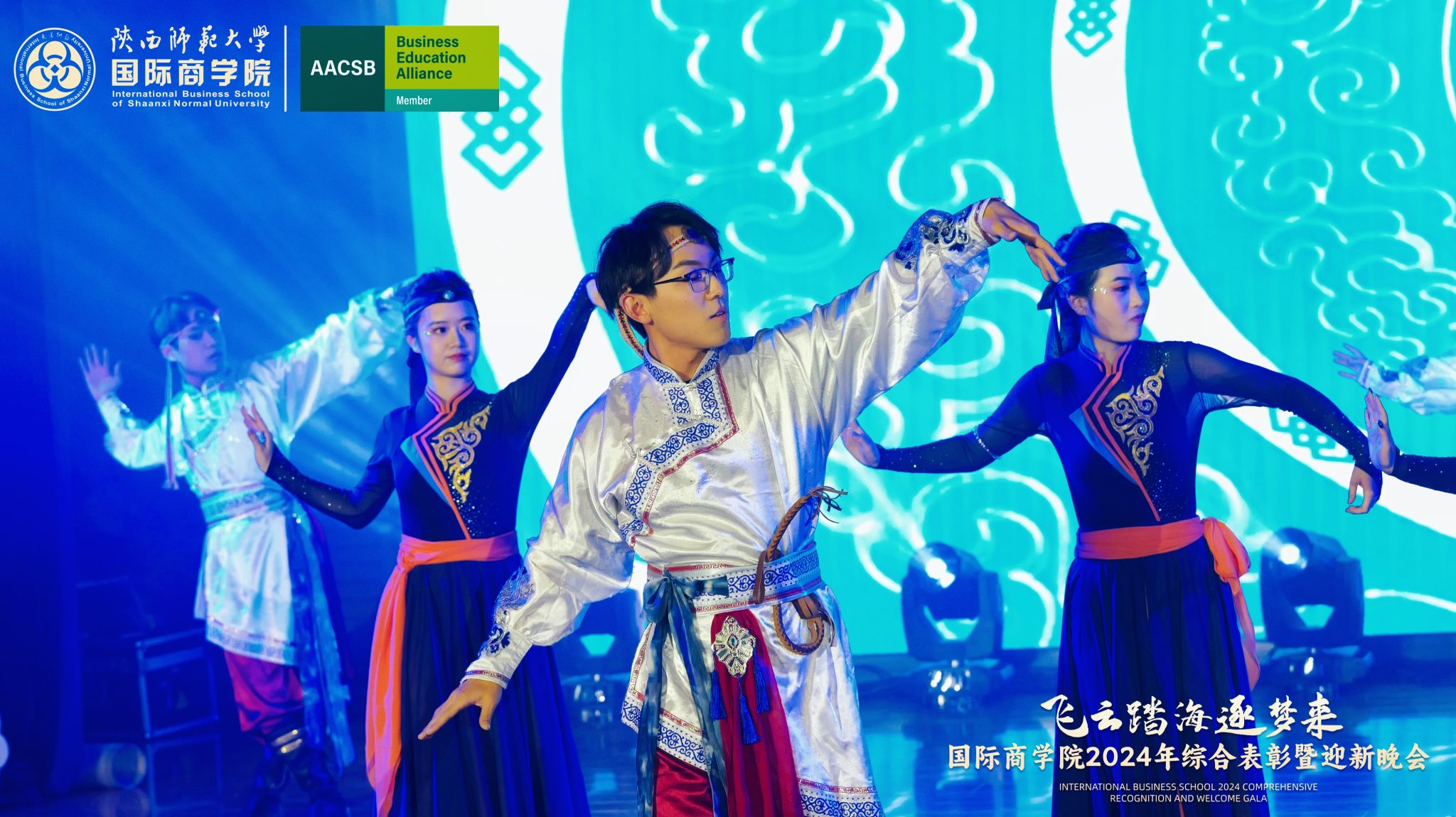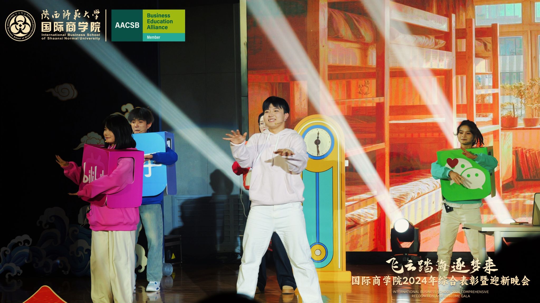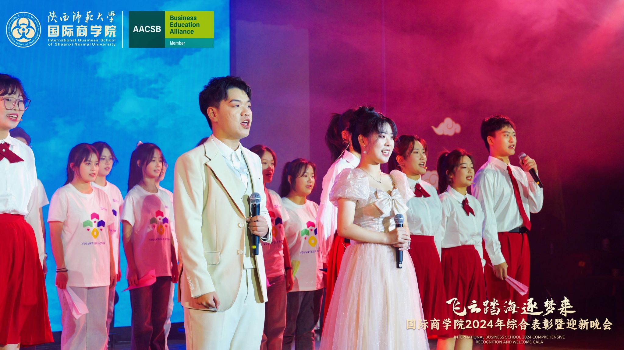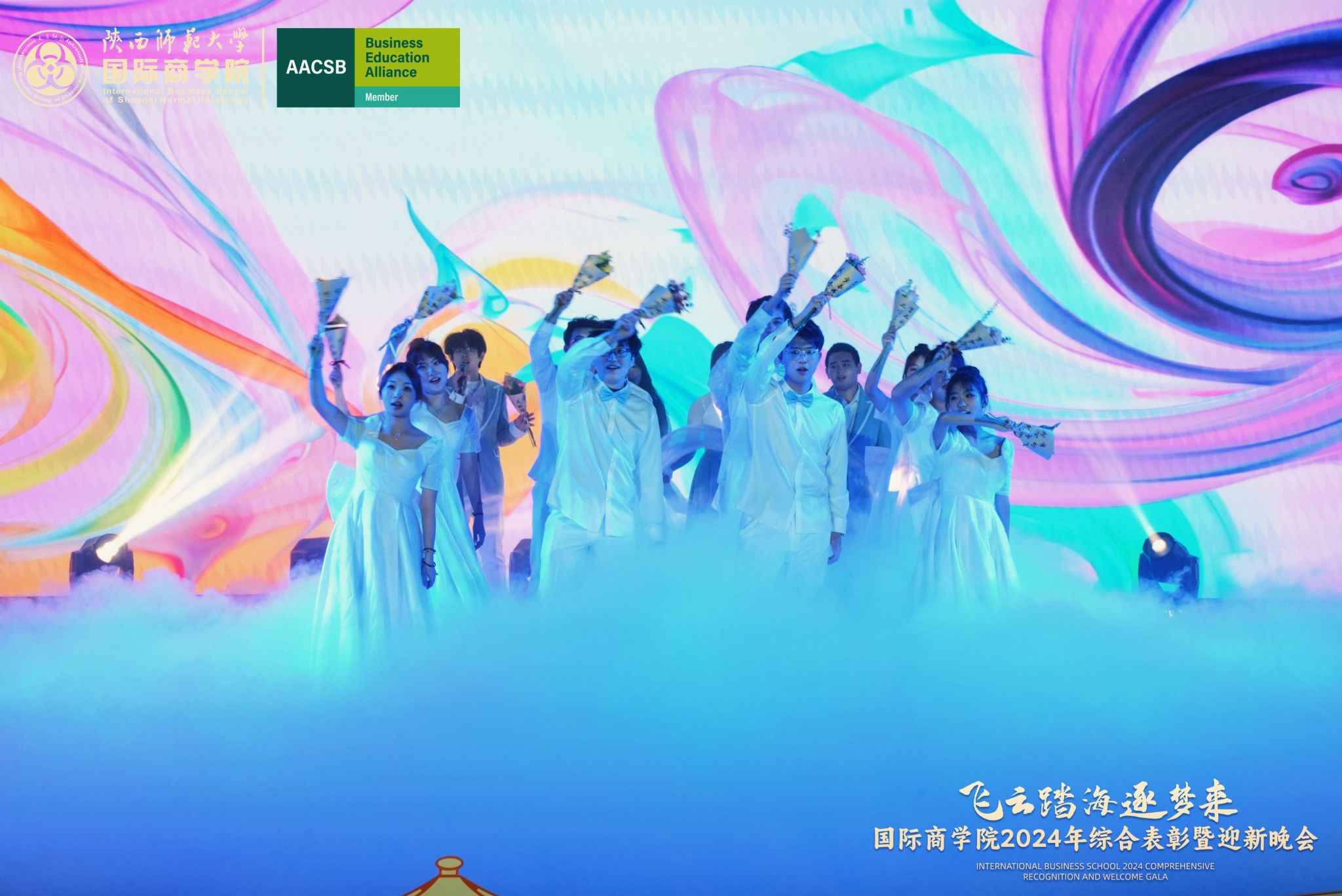 晚会上,来自学院的300余名研究生、本科生为现场观众呈现了一场精彩的视听盛宴。开场舞《飞云踏海逐梦来》以灵动之姿,绘新年繁盛之景,引吭高歌,唱响时代的旋律。第一篇章现代舞《梦想嘉年华》舞步间丈量梦想无垠,汗水里浇灌成长盛放,梦想照进现实,青春永不落幕;主旋律音画时尚《见信如晤》商院才俊,细语低吟,旋律飘渺,倾吐心扉;校园轻喜剧《时间都去哪了》回忆起入学时的青涩,笑迎每一个新的开始,心中满是喜气洋洋;活力歌伴舞《赞赞陕师大》共贺祖国七十五载盛世华诞,共祝师大八秩荣光璀璨征程。第二篇章民族大联欢《星辰大海踏歌去》五彩斑斓的服饰,舞动着千年的传说,跨越山川湖海,传递和平与希望的讯息;相声《恋爱专家》妙语连珠,将恋爱中的点点滴滴娓娓道来,让我们领悟爱情的真谛,在欢笑中感受甜蜜与智慧的碰撞;古典舞剧《上春山》盎然春意随舞者轻盈的身影扑面而来,以舞蹈为语言,连接过去与未来;由蓝草吉他社带来的器乐演唱《奔·流》带着一往无前的气势,唤醒我们内心深处的热爱与渴望。第三篇章情景歌剧《紫荆花盛开》传递着团结与友爱的力量;原创爆笑喜剧《甄嬛传之谁动了朕的外卖》笑点连连,戏谑中见智慧;舞蹈串烧《童心向未来》续写着属于我们的童话世界;现代舞《主人公》在每一次律动中释放力量,作为自己生命的主人公,书写着独一无二的故事。最后,晚会在屈晓倩、杨涛、张博雯等及白菜官网博雅合唱团联袂演唱的《歌声与微笑》中落下帷幕。